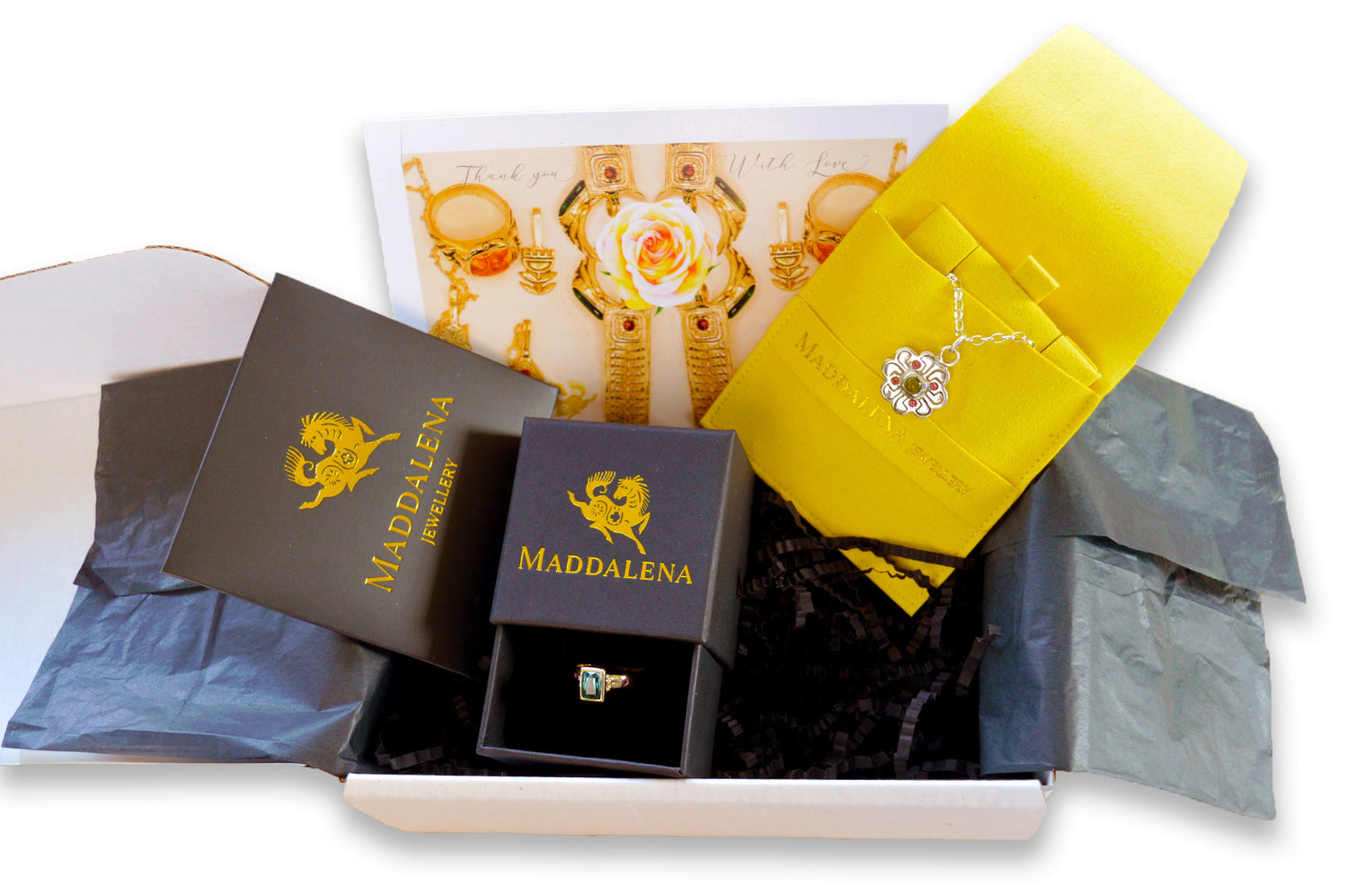 Exquisitely packaged jewellery, showcasing the beauty of each piece. Includes a complimentary cleaning cloth with every purchase. The packaging is sustainably made from recycled paper and cardboard.