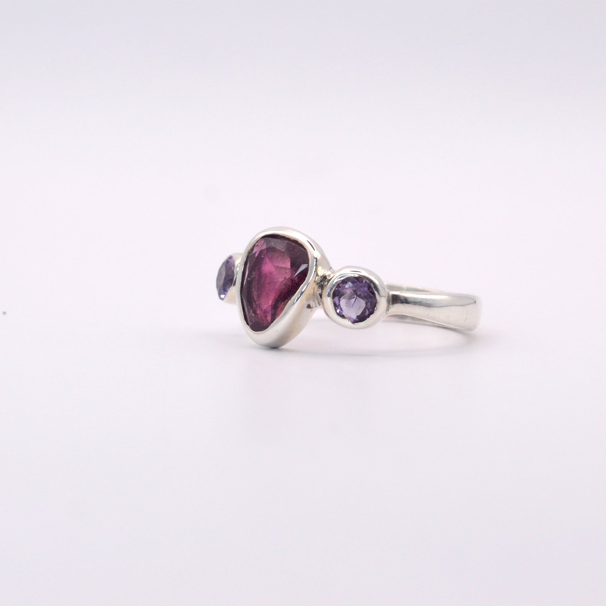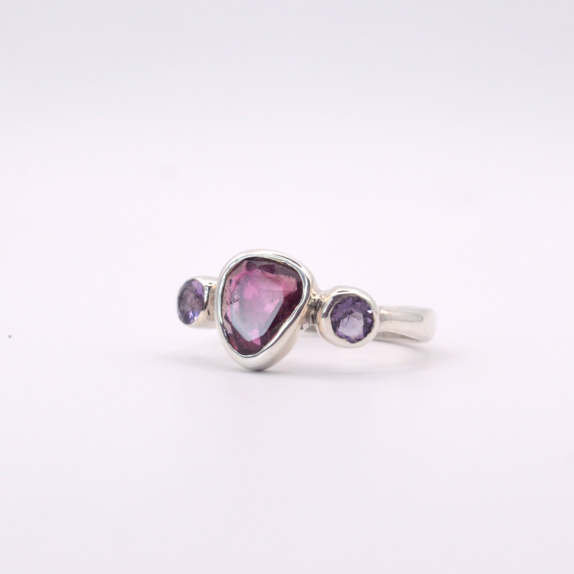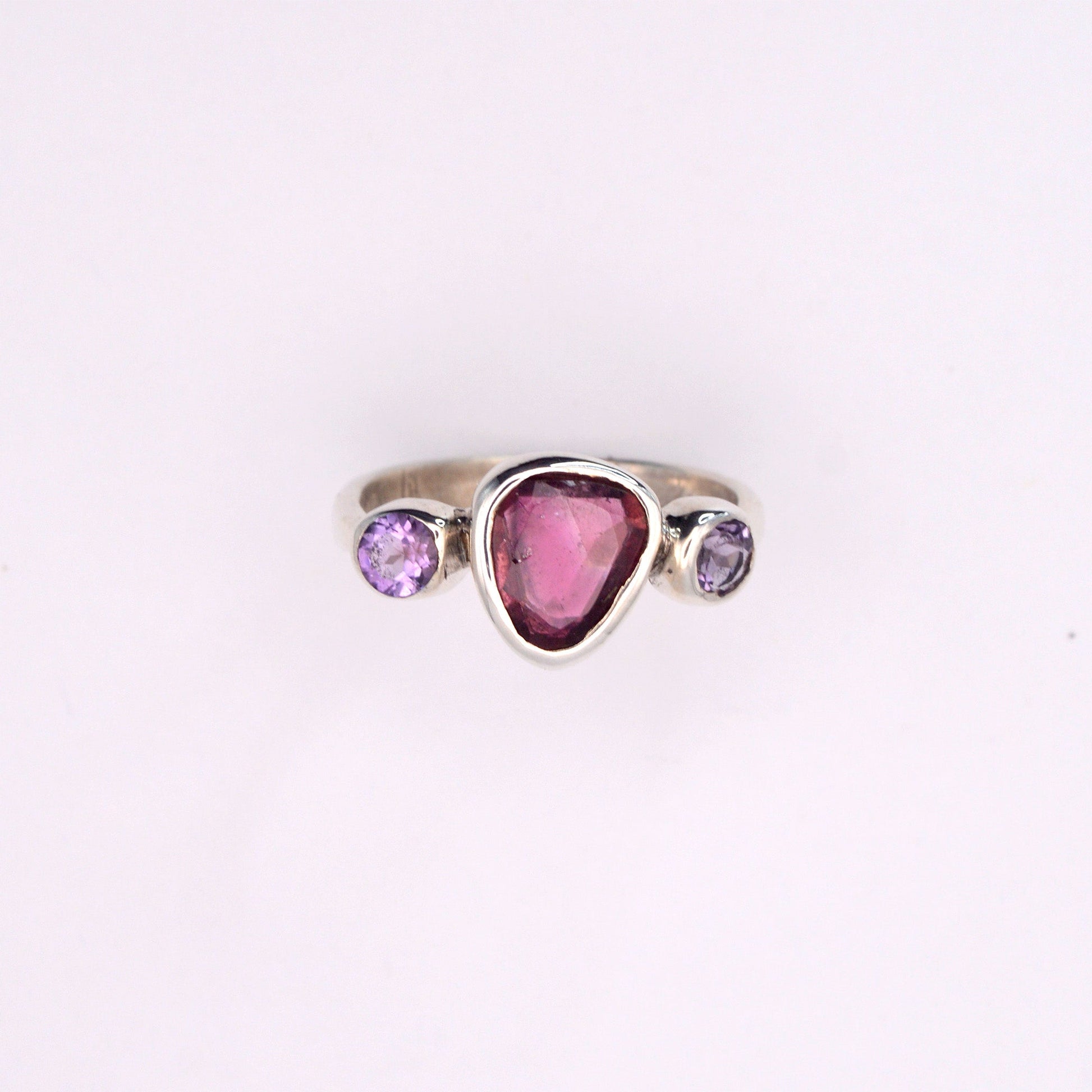 Handcrafted with precision and expertise, the Athena ring is truly one of a kind. The stunning Pink tourmaline centre is complemented by purple amethyst gemstones on each side, adding a touch of elegance to any outfit—a unique piece for the discerning connoisseur.