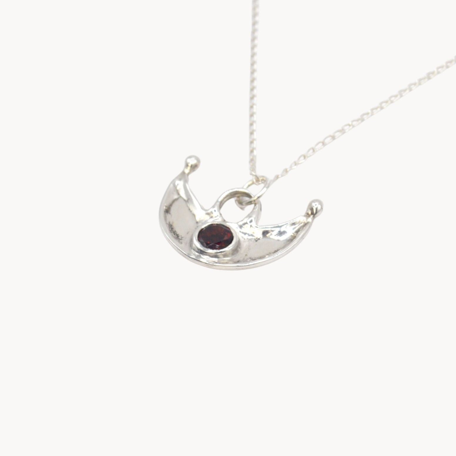 Crafted by hand from solid sterling silver, the Garnet Moon pendant features a natural Garnet gem at its centre. Its elegant design pairs beautifully with beaded gemstone necklaces and chains, making it an excellent choice for layering. This piece combines expert craftsmanship with versatile style, perfect for adding a subtle yet distinctive touch to your jewelry collection. This elegant necklace comes complete with a chain. Add a touch of sophistication to any outfit with this one-of-a-kind piece.