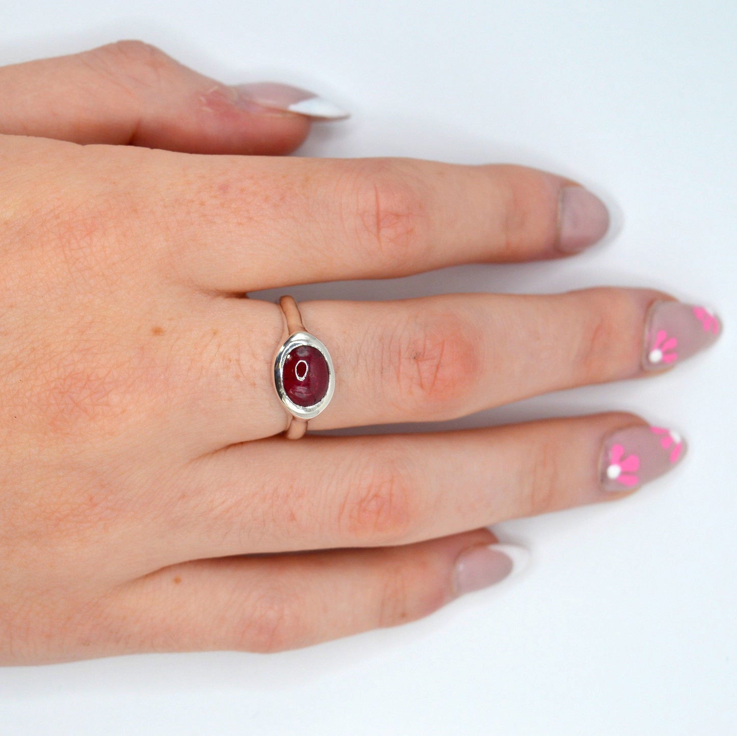 This handcrafted garnet ring is crafted from solid sterling silver, featuring a soft, smooth, and curvy design that highlights an oval natural Raspberry Pink Rhodolite Garnet Oval Cabochon at its center. Expertly made, it offers both elegance and comfort. Pair it with the stunning 18ct gold garnet necklace for a coordinated and sophisticated look.
