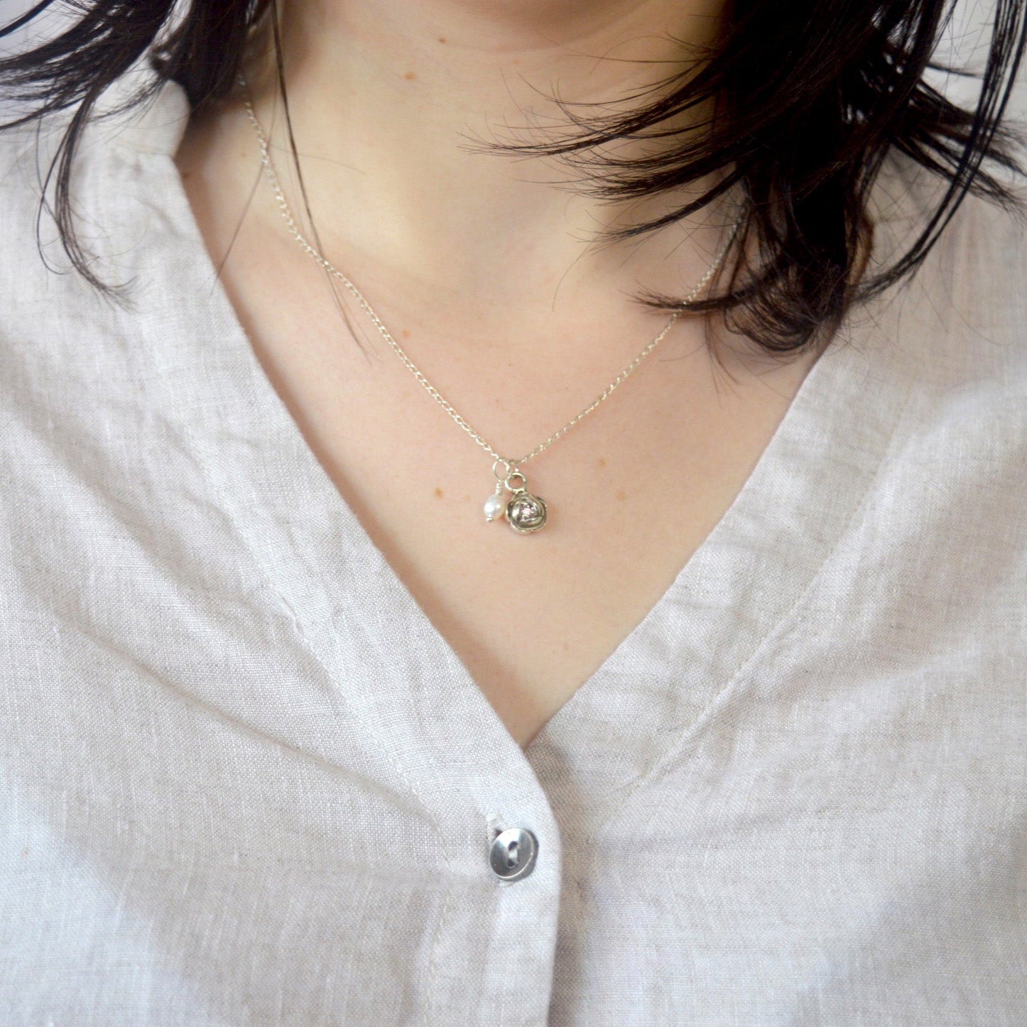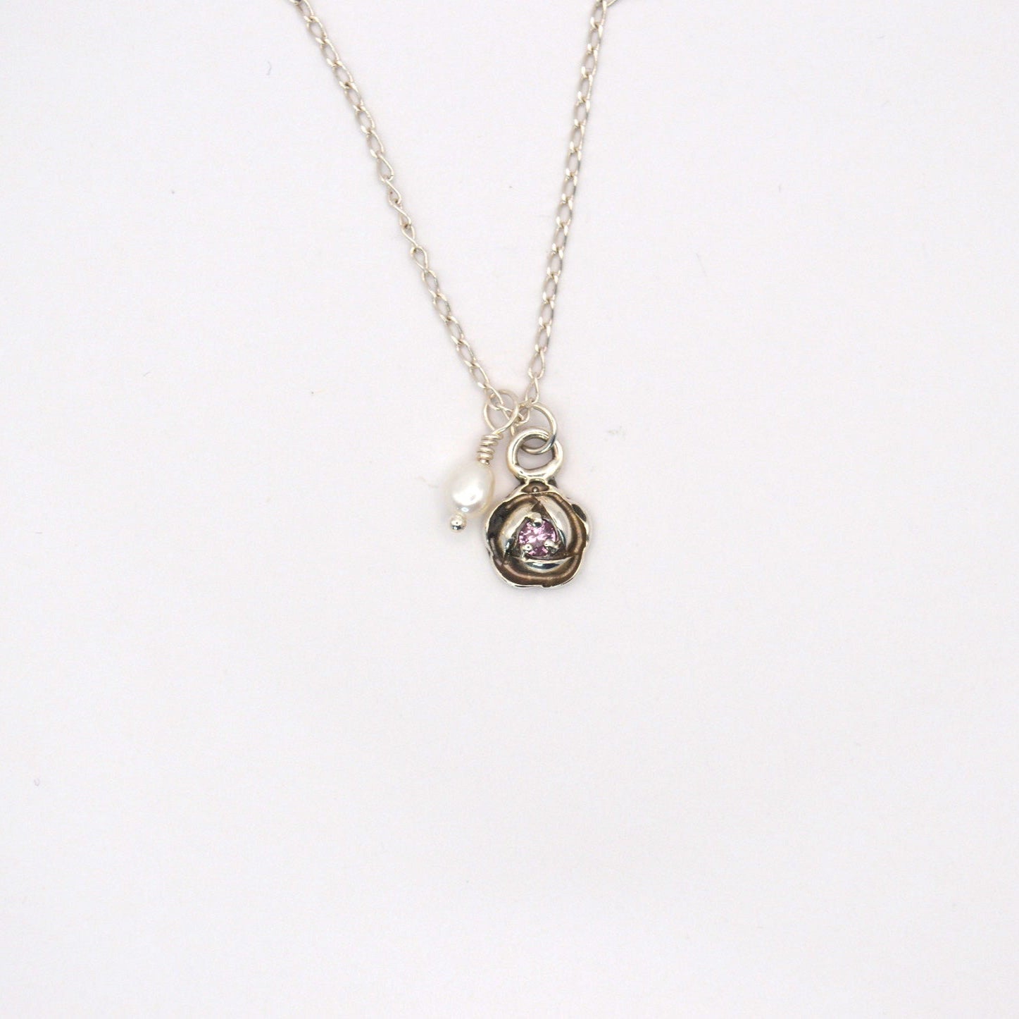 Crafted from solid sterling silver, this rose necklace features a beautifully carved design that encases a natural pink Sapphire and a freshwater pearl. The delicate chain included makes it perfect for layering with other jewellery pieces. Add a touch of elegance and femininity to any outfit with this eye-catching accessory.